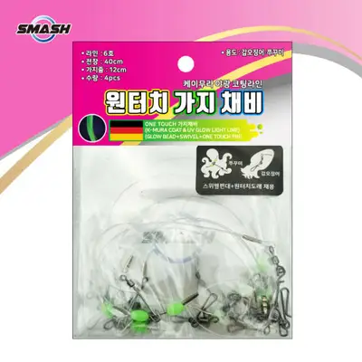 케이무라 야광 코팅라인 원터치 가지 채비. 스위벨 편대+원터치 도래 채용으로 줄고임 방지 및 에기교체가 편리. 케이무라 UV라인 사용으로 대상어에 어필력 증가. 원하는 단차에 따라 위아래 뒤집어 사용 가능.
