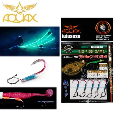 바늘6호 라인5호 사이즈3.5cm. 더 강한 라인 강도를 필요로 하는 대형어 타겟에 적합합니다. 코팅된 바늘과 야광 틴셀라인이 적용되어 있으며, 아쿠아엑스 고급합사 "블랙아이언"으로 제작되어 강도와 직진성을 모두 확보했습니다.