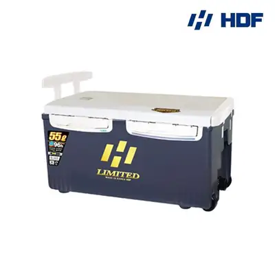 HB-376 리미티드 아이스박스 55ℓ [보냉력 96h]. 국내 제작 아이스박스로 보냉력·내구성·사용성이 우수하며 좌우 어느 방향에서도 열 수 있는 설계, 5면 압축 충진, 경사배수구 및 어깨끈, 우레탄 바퀴가 적용된 대형 어종용 아이스박스이다.
