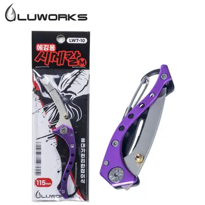 L 사이즈 에깅용 접이식 시메칼. 보다 큰 사이즈로 사용이 편리하며, 날카로운 칼날과 바늘 각도 교정기, 가프 기능 탑재. 휴대용 카라비너 후크 포함.