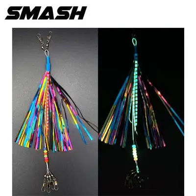 스메쉬 레인보우 필스커트 색동 축광구슬 문어채비. 층·심플하고 화려한 칼라로 호기심이 났구슬 많은 문어에 강한 어필. 자연스러운 움직임을 겸비한 풍성한 스커트에 축광효과 꼴뚜기 채용. 축광 꼴뚜기와 구슬, 스냅도래의 조합으로 여러개의 에기와 봉돌까지 동시결속.