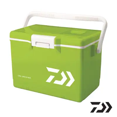 다이와 쿨라인 GU 800X 라임 그린 쿨러백. 보냉 기능을 가진 낚시용 가방으로 보이는 800X 모델입니다.
