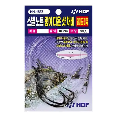 광어 다운샷 선상 낚시 전용 채비. 정확한 훅킹력과 내구성이 강한 국내산 고탄성 와이드 갭 웜 훅 채용. 스넬 노트로 매듭하여 웜 장착시 수평을 안정적으로 유지.
