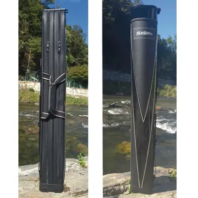 민물낚시용 2단 가방. 상단 손잡이로 손쉬운 운반이 가능하며, 고급스러운 패턴과 로고, 이중 TR로 견고한 어깨끈, 편안한 그립 손잡이가 특징입니다.