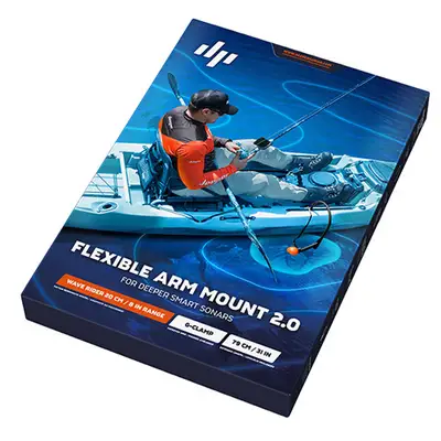 Deeper Smart Sonar Flex Mount 2.0. 여러 배와 카약에 고성능 소나를 장착할 수 있는 플렉서블 암마운트. 길이 79cm, 20cm 조절 가능, 70mm/2.7in 두께까지 고정, 20kg/44lb 하중 지지.
