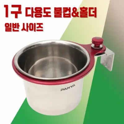 레드 컬러의 알루미늄 홀더와 스테인레스 컵 세트. 좌대에 장착하여 물컵과 홀더를 함께 사용할 수 있는 다용도 제품.