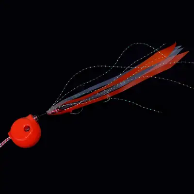 핏빛 광택의 레드 칼라 타이라바에서 흔히 선택되는 색상 중 하나입니다. 타이라바 색상에 대해서는 여러 가지 가설과 경험에 따른 선택이 있습니다. 정답은 없지만, 참돔을 비롯한 바다 물고기들이 색상이나 야광, UV 등을 식별하고 반응하는 것으로 알려져 있습니다. 물색이 밝거나 어둡거나 또는 수심이 얕거나 깊을 때 다양한 색상을 바꿔가면서 효과를 볼 수 있습니다. 타이는 불투명 흰색과 오렌지 두가지를 채용했고, 틴실로 마무리 하였습니다. 측부 가운데에는 눈알을 상징하는 붉은 빛 원형 고무 처리되어 있습니다.