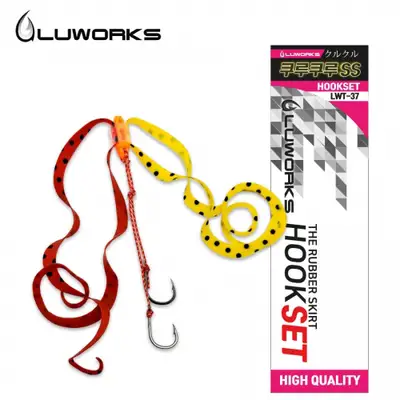 12색의 화려한 라인업 프리미엄 훅 셋트. 루웍스 쿠루쿠루는 폴링시에 스커트가 물의 저항을 받아 빙글빙글 도는 듯한 움직임을 내도록 디자인. S사이즈 2개로 이루어진 혼합형으로 가장 일반적인 상황에 사용가능한 표준 세팅 훅세트. 소재: 실리콘 스커트, 씨헌터 8합사, 9호+10호 바늘.