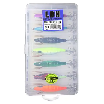주꾸미/갑오징어용 에기 세트. 양면 태클박스와 에기 7마리 구성.