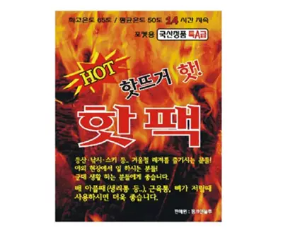 국산 특A급 대용량 150g 핫팩. 최고온도 65도, 20시간 지속 발열. 야외 활동, 군 장병 야간근무, 생리통 완화 등에 사용.