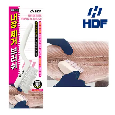 생선 내장 손질 후 잔여물이나 핏물을 손쉽게 제거하는 V형 구조 브러쉬. 곡선형 손잡이로 편리한 사용감 제공. 밑밥통 내부 처리 및 도마 세척 등 다양한 용도로 활용 가능.