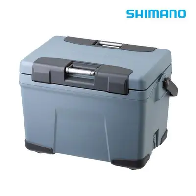시마노 바실랜드 쿨러 PRO 40리터 앤빌그레이. 최대 얼음 유지 기간 312시간, 레버 강화 구조, 좌우 듀얼 오픈 및 분리형 뚜껑, 원 액션 물빼기 적용.