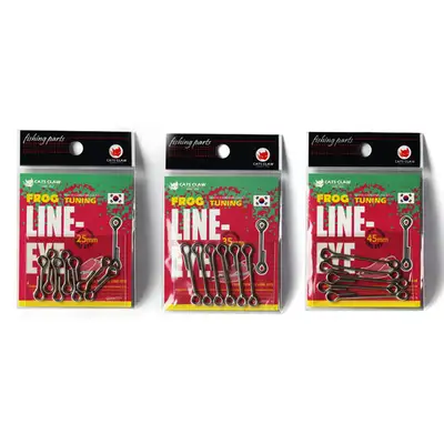 프로그 루어 튜닝용 라인아이. 스테인레스 소재로 제작되어 강한 육식성 민물고기의 힘을 견딜 수 있음. 다양한 사이즈로 여러 종류의 프로그 튜닝에 사용 가능.