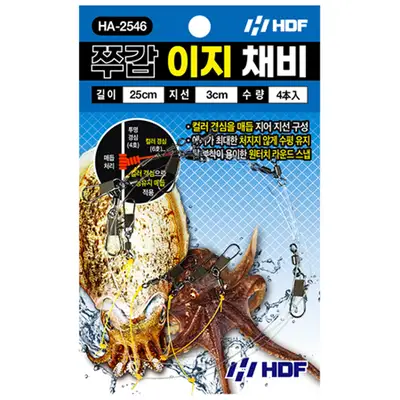 쭈꾸미·갑오징어 간단 채비. 매듭을 지어 라인이 처지지 않도록 지선을 연결. 에기가 최대한 처지지 않게 처리하여 조류에 의한 수평을 최대한 유지. 루어의 자연스러운 움직임 연출. 탈·부착이 용이한 원터치 라운드 스냅 구성.
