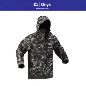 오닉스 하이드로보어 기능성 미드나이트 그린 자켓. 100% 방수 및 발수 기능을 제공하며, Aluminum Lining 설계로 추운 날씨에 체온을 유지시켜줍니다. Mossy Oak Aqua 패턴으로 위장 효과가 뛰어나며 3M 반사 스티커로 야간 식별이 가능합니다.