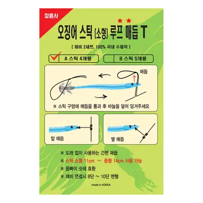 스틱 4개용 채비. 루프 T매듯 방식으로 제작된 오징어 채비. 스틱 소형 11cm ~ 중형 14cm 사용 가능. 옵케이 솟테 호환. 채비 연결시 8단 ~ 10단 변형 가능.