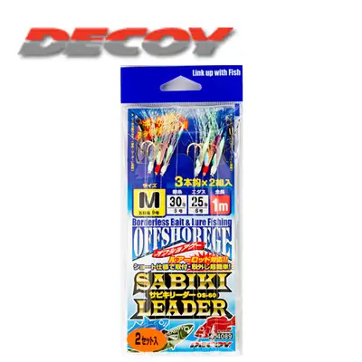 DECOY SABIKI LEADER. 지깅용 리더로 다종류 타이라버 조합에 대응하는 사비키 리더세트. 사비키 라인, 플로로 카본, 플래시 틴셀 구성으로 다양한 어종 대응과 반짝이는 어필을 노린다.