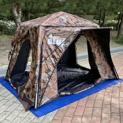4개의 다리 모두 지형에 따라 높낮이 조절가능, 반자동 텐트 헤드 고정 방식