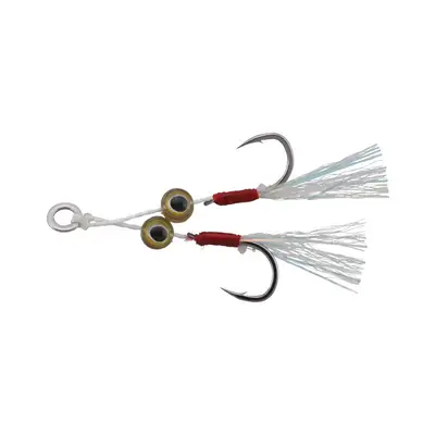 SLS(슈퍼 라이트 쇼어) 전용 지그 BIGBACKER FIT JIG의 어시스트 후크 예비 부품. 눈 비즈와 틴셀로 구성된 목력 후크로 작은 물고기 무리를 연출해 어필력을 높이며 마이크로 베이트 패턴에 효과적.