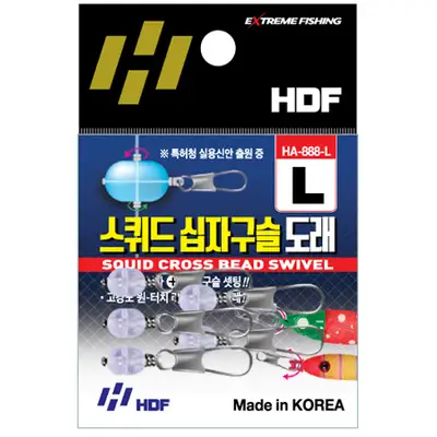 L 사이즈. 케이무라 십자(+) 회전 구슬이 셋팅된 에기(Egi)류 탈착용 기능성 도래. 자외선을 받아 가시광선으로 발광하는 이미지. 루어, 한치메탈, 스퀴드 지그(숫테) 등의 자연스러운 움직임을 연출하는 라운드 구조.