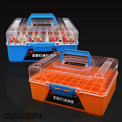 70구 태클박스. 에기를 세워서 보관하고 간편하게 꽂아서 사용. 바늘이 엉키지 않고 에기 손상 방지. 10구X7줄로 70개 수납 가능.
