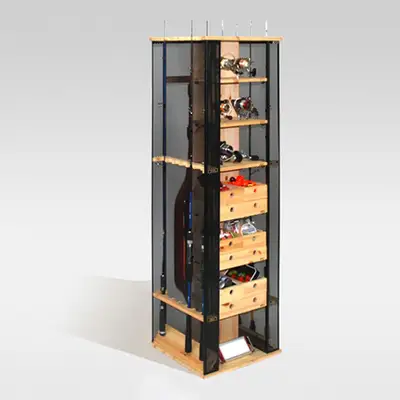 [해품장 - ML450L] 편칭메달 루어 2M가 넘는 원피스 로드까지 수납 가능한 바다 및 루어 전용 수납장. 하부의 회전 둘레일 장착으로 회전하면서 장비를 보관할 수 있어 편리합니다. 편칭메달의 혹은 수납선반 및 거치대를 사용자의 편의에 따라 자유롭게 이동하므로 공간활용 높습니다. 타공판후크 및 자석을 이용하여 다양한 소품 장식 가능.