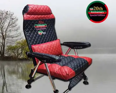 레드/블랙 색상의 20th Anniversary Special Edition 럭셔리 와이드 낚시의자. 꿀팅 원단 사용으로 더욱 리셔리한 디자인. 와이드 사이즈에 허리쿠션과 목쿠션이 장착되어 장시간 낚시에도 편안함을 제공합니다.