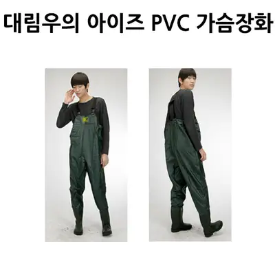 체스타 PVC 가슴장화. 바닥에 미끄럼방지 처리, 심플한 디자인, 보온성 뛰어남, 소지품 보관용 주머니, 벨크로테이프 어깨곤 조절 가능.