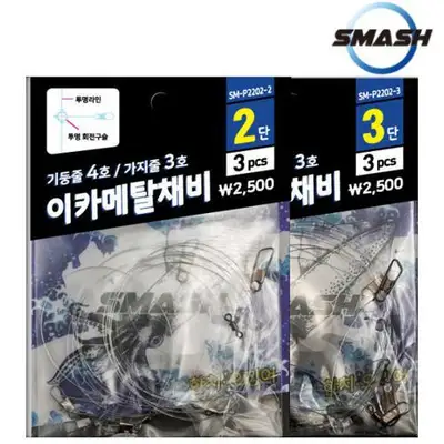 한치 이카메탈 채비. 투명 회전구슬과 투명 라인을 사용하여 대상어의 경계심을 낮추고 예민한 입질 파악에 용이. 핀도래 사용으로 숫테 교체가 편리하며, 롤링도래로 줄꼬임 해소.