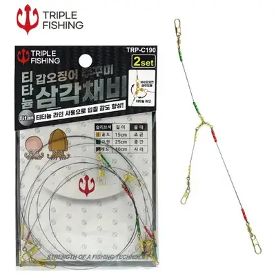 360도 회전 라운드 도래와 티타늄 라인을 사용한 갑오징어/주꾸미 삼각채비. 물때에 따라 가지 길이를 선택하여 사용 가능하며, 슬리브 색상으로 라인 길이를 쉽게 구분할 수 있음. - 라운드도래 - →그린 슬리프 →레드슬리프 → 골드 슬리프 레드슬리브라인→40cm - 골드 슬리프 라인 15cm ※ 사이즈를 재는 위치에 따라 차이가 있을 수 있습니다. ← 그린 슬리브 라인 25cm