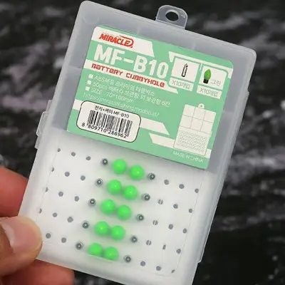 물방울형 그린 전자케미 배터리 보관함. 50pcs 배터리 또는 케미 보관 가능. 하부 검정 코팅으로 빛 분산 방지. 원터치 잠금장치. EVA 쿠션 포함. 케미 10EA/배터리 10EA 포함.