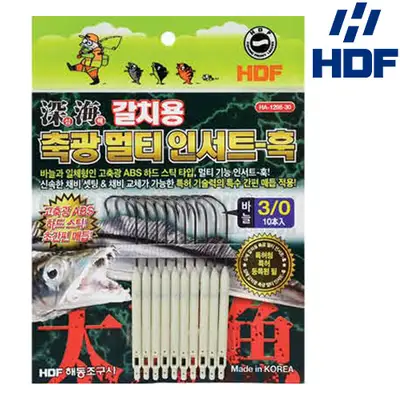 HDF해동 축광 멀티 인서트 훅 (HA-1298) 3,000원 (50,000원 이상 구매 시 무료) 메듬 후 반드시 자투리 구멍에 라인을 끼워 마무리 해야 합니다! 고축광 ABS 하드스틱 자선 손실 시 간편 메듬을 통해 목줄 길이 조절 및 초간편 목줄 교체 가능 HA-1298 심해 갈치용 축광 멀티 인서트-훅 ■ 바늘 교체 시, 간편 메듬을 통해 바늘을 교체할 수 있는 편리성이 우수한 특허 기술의 고성능 훅 ■ 바늘과 일체형인 고축광 ABS 하드 스틱 형태로써, 대상어의 갈무리 시 손가락 부상의 염려 없이 바늘 제거가 편리한 구조 ■ 갈치 자작(自作) 채비 및 다양한 튜닝이 가능한 스페셜 아이템 ■ 라인(자선) 분리 후, 추후 출조 시 바늘만 별도 사용이 가능한 실속형 모델