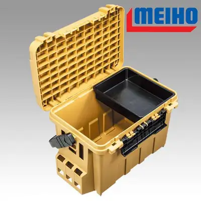 메이호 버킷 마우스형 대용량 태클박스. 방파제/제방/보트 위에서 의자·발판으로도 사용 가능하며 물보라 유입을 줄이는 구조와 라인 홀더 홈, 플라이어 홀더 기능이 포함된 35L 수납 전용 수중용 태클박스.