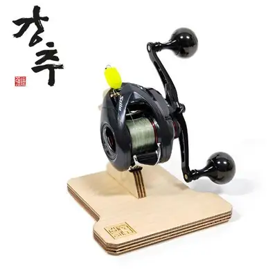 스피닝 & 베이트 릴 모두 공용 거치 가능한 5mm 아크릴 고정핀 사용. 상단 사다리꼴 아크릴 핀으로 릴을 안정 고정하고 하단 비스듬한 원목 부분이 받쳐 릴 풋을 견고하게 고정함.