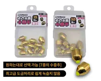 루웍스 순간수중 수중추는 정확한 부력을 자랑하며 조류타는 능력이 탁월한 제품으로 빠른 조류에도 신속하게 원하는 수심층에 도달합니다. 최고급 도금처리로 쉽게 녹슬지 않으며, 상황에 맞는 다양한 호수 선택이 가능합니다.