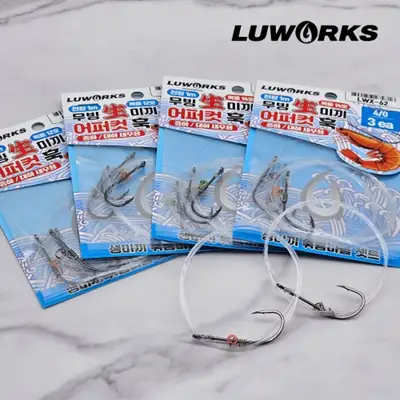 중하/대하 새우용. 4/0 바늘로 목적어에 맞게 셋팅하여 사용. 12호 목줄로 대물 입질에도 터지지 않는 충분한 인장강도.