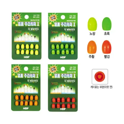 4가지 컬러를 색상별로 각각 단일 포장화한 제품. 최대 최적으로 최상의 시인성을 확보하는 낮 케미 특제품. 특수 광확산제 안료를 코팅하여 햇빛 난반사 속에서도 선명도가 탁월. 야간용 3mm 케미라이트와 중량, 부력 완전 동일.