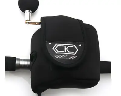 전동릴용 보관 파우치. 네오프렌 소재로 방수 및 충격 흡수 기능. 원터치 벨트 결합 방식으로 사용 중 케이스 씌우기 가능.