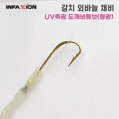갈치 외바늘 채비 UV도깨비튜브(케이무라)는 자연산 어피 사용으로 집어력 상승, 털림이 덜한 쌍미늘 2/0 바늘 사용, 지선 2m 20호 경심줄(삶은줄) 사용. UV도깨비 튜브 사용으로 야간 시인성 향상.