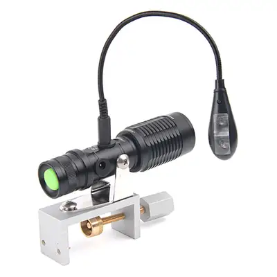 낚시용 초강력 랜턴. UV 보라빛 라이트와 XPE 블루 라이트 중 선택 가능하며, 줌라이트 기능, 고정 바이스, 5단계 모드, FM6V 배터리 사용이 특징입니다.