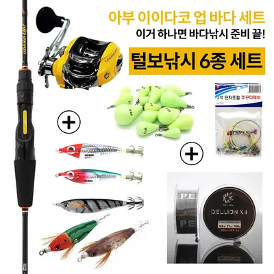 이이다코 업 바다세트는 바다 낚시를 위한 6종 세트로 구성되어 있습니다. 털보낚시 6종 세트, 3색 단자 조절 주꾸미 채비, TRIPIS, YO-ZURI, DELLION X4 등이 포함되어 있어 바다 낚시 준비를 한 번에 완료할 수 있습니다.