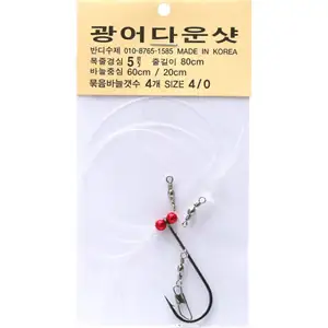 묶음바늘채비 4개입. 목줄경심 5호, 백 줄길이 80cm, 바늘중심 60cm / 20cm, 스트레이트 죽 4/0 (웹이탈방지죽)