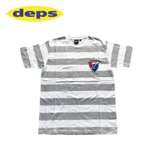 전면의 독특한 패치 디자인과 스트라이프 패턴이 들어간 뎁스의 반팔 티셔츠입니다.
