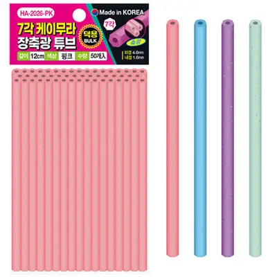 7각 케이무라 장축광 튜브 12cm 덕용. 케이무라 특유의 자외선 반사 효과와 장축광 기능 및 실버필 조합으로 탁월한 집어력 발휘. 축광 밝기와 지속시간이 뛰어나 어두운 수심에서도 오랫동안 빛을 유지. 유연하고 내구성 좋은 고품질 실리콘으로 제작되어 갈치 채비 목줄 보호용으로 최적의 실리콘 튜브.