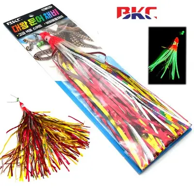 대왕문어채비 (BK-893) 스커트꼴뚜기 피문어채비. 고급 색동 스커트, 레드헤드 야광꼴뚜기 + 야광파이프 + 구슬 조합, 고강도 인터락 핀도래, 버림 봉돌 채비. 라인:30호, 버림라인:10호.