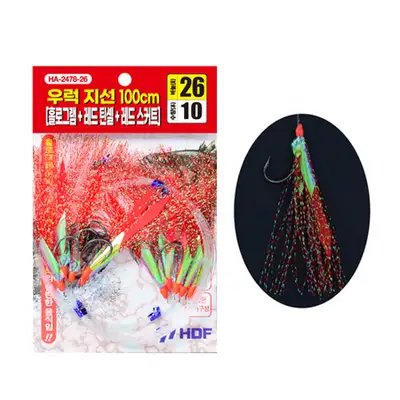홀로그램 어피와 레드 틴셀, 레드 스커트 구성으로 대상어 유인력을 최상으로 극대화한 타입 지선 교체형 채비로 필드상황에 맞게 지선의 길이를 조절하여 사용 부드럽고 인장력이 우수한 라인 적용 다양한 채비 구성으로 대상어의 어필이 강한 채비를 손쉽게 교체 가능한 지선 채비