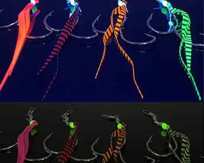 형형색색의 고품질 실리콘 스커트를 이용한 대구 쌍바늘 채비입니다. 조류로 인해 살망거리는 액션으로 수심 깊은 곳에서의 대구를 유혹합니다. 국내수작업의 강력한 매듭과 대상어의 강한 입질에도 쉽게 빠지지 않는 인장력을 자랑합니다.