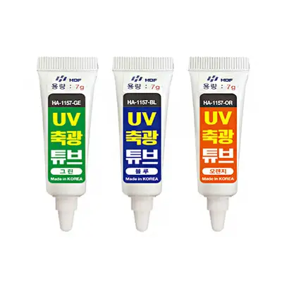 튜브형태로 낚시장비와 원하는 부분에 직접 바르는 초강력 장축광 튜브. 휴대성 우수, 다양한 낚시 환경에 대응이 가능한 타입. UV라이트나 태양광선에서 발산되는 자외선 흡수, 물 속 어두운 곳 대상어에게 밝게 인식.