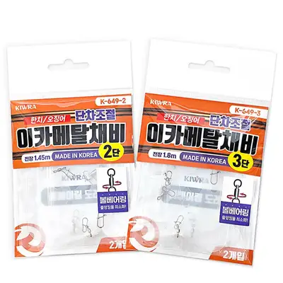 단차조절 이카메탈채비 2단/3단 구성. 볼베어링 도래와 프리미엄 카본사를 사용하여 줄꼬임 방지 및 입질 전달이 빠름. 상황에 맞게 단차 조절 가능하며, 국산 프리미엄 부자재로 제작된 에깅 채비.
