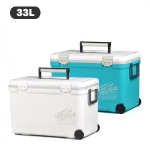 33리터 용량의 아이스박스로 바퀴와 어깨끈, 손잡이가 포함된 휴대용 쿨러입니다.